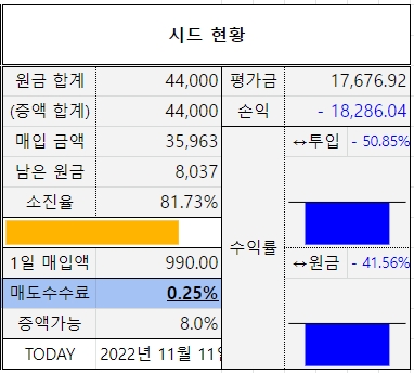22.11.03 - 7차 쿼터손절 진행 ㅡ.,ㅡ^ (6차를 41회분까지 한다고 괜히 끌다가.. 하필이면 어제 10% 폭락을 맞다니.. ㅡ.,ㅡ^ 역시 처음 원칙대로 진행하기가 쉽지 않구나.. 사람 마음이라는게 참으로 간사하다..)