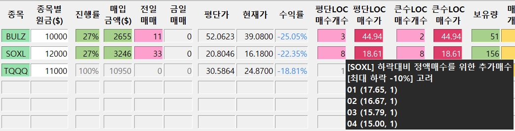 3) SOXL (시드 100% 소진, 존버 중) : $16.10 (-4.90%)