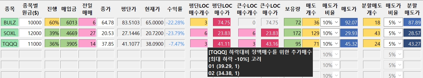 | 일자 | 쿼터손절차수 | 매도가($) | 수량 | 손실액($) | 수수료($) | 총 손실($) | 누적손실($) |