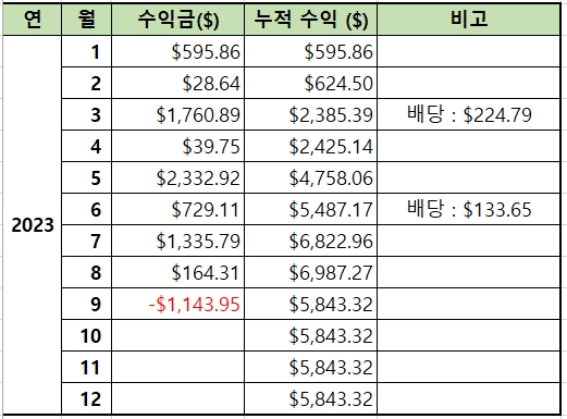 | 22.11.10~11 | 전량 매도 | 11.94~13.22 | 967 | -973.92 | 3,842.96 |