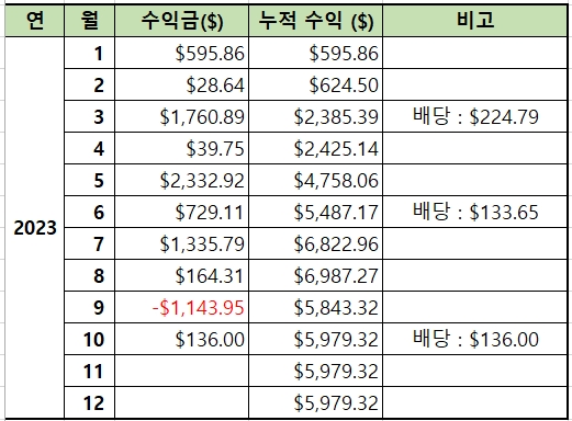 | 22.11.10~11 | 전량 매도 | 11.94~13.22 | 967 | -973.92 | 3,842.96 |