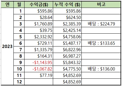 | 22.11.10~11 | 전량 매도 | 11.94~13.22 | 967 | -973.92 | 3,842.96 |