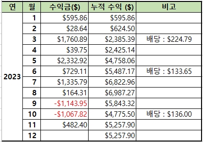 | 22.11.10~11 | 전량 매도 | 11.94~13.22 | 967 | -973.92 | 3,842.96 |